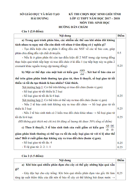 Đề thi chọn HSG môn SINH HỌC lớp 12 tỉnh Hải Dương (2017-2018) Đề thi chọn HSG môn SINH HỌC lớp 12 tỉnh Hải Dương năm học 2017-2018 A. ĐỀ THI B. ĐÁP ÁN
